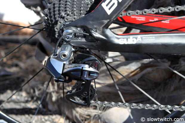 The Shimano Dura-Ace rear derailleur shows that it is quite new.