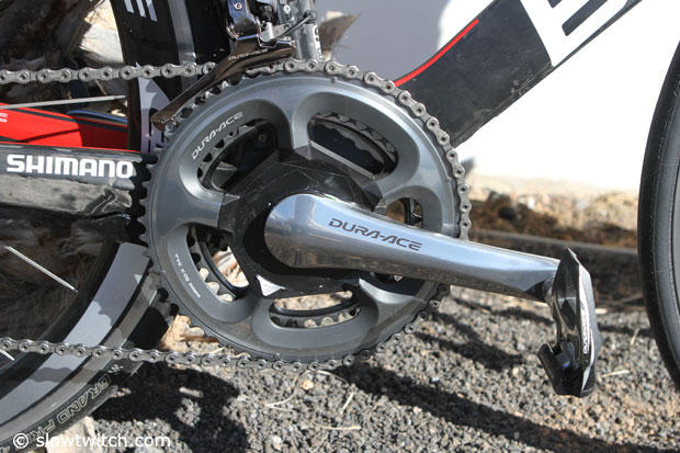 Shimano-Dura Di2 components and a covered up SRM powermeter. Why covered? Aernouts thought the green decals did not match the new bike.