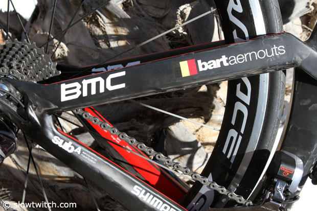 The 2014 UPlace-BMC triathlon team is currently on Lanzarote in the Canary Islands for a training camp and here are images from the BMC TM01 that Bart Aernouts is riding here. Aernouts who is 1.82 meters tall switched this season from a size Medium Short to a size Small, and that makes the frame 1cm longer and a bit lower.