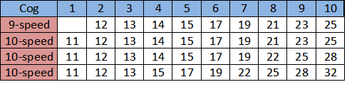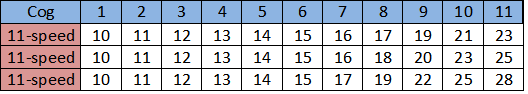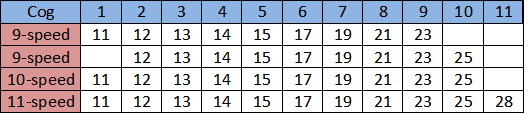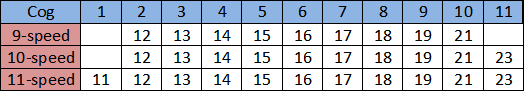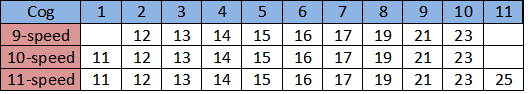 On the smaller end of things, let’s start with a narrow 9-speed 12-23. 10-speed gives us an 11-tooth cog, while 11-speed gives us a full 11-25 range.
