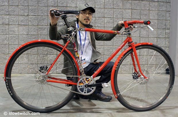 Rob English did not exhibit at the 2014 Handmade Bicycle Show but we spotted this beautiful crafted bicycle of his in the Campagnolo booth and snagged it for detailed pics.