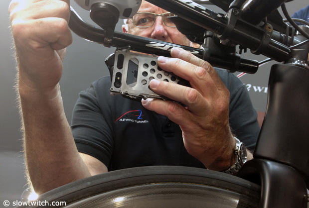 Time now to switch the pegs that hold the bike in the wind tunnel to the final bike of the day.