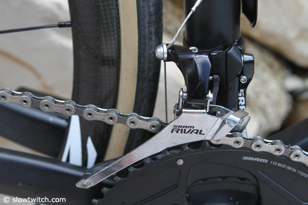 The Rival 22 front derailleur features Yaw cage technology and an integrated chain spotter. Weight is reported to be 88 grams with said spotter.