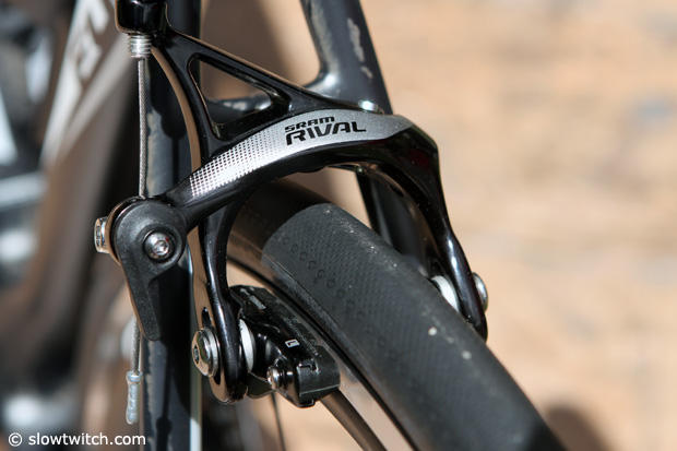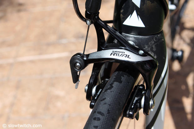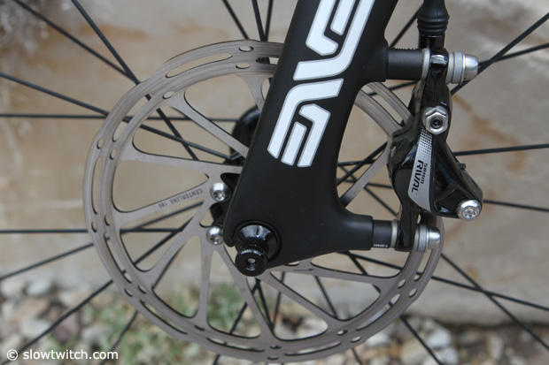 The rear Rival 222 hydraulic disc brake setup features forged aluminum calipers and stainless steel hardware. Weight per wheel with lever, rotor and line is 493 grams.