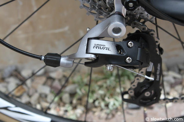 Up close with the SRAM Rival 22 rear derailleur. This mid-cage offering works with cassettes with up to 32 cogs. Weight 191 grams.