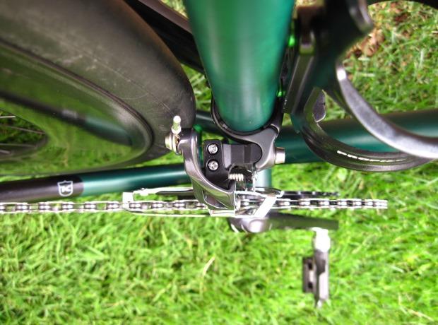 Originally, I was having a huge amount of trouble getting the bike to shift in to the large chainring. The shifter simply could not pull enough cable. After a lot of investigation, I discovered that the issue was the bike’s small 28.6mm diameter seat tube. A small diameter tube means that the derailleur is sitting close to the frame. It was just close enough to be outside of Shimano’s spec window, and the whole system wouldn’t work. The fix was a 32mm Shimano clamp with shims for a 28.6mm seat tube – this moved the derailleur out just enough compared to my skinny 28.6 clamp.