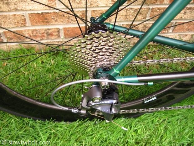 I threaded an Ultegra 6800 bottom bracket in to that BB shell, and plugged in a pair of 170mm Rotor 3D compact cranks with 52/36 TT Q-rings. Why solid aero rings for a road bike? After many, many trials and setups with Q-rings, I find that – all else equal – the TT rings shift slightly better. And look cooler.