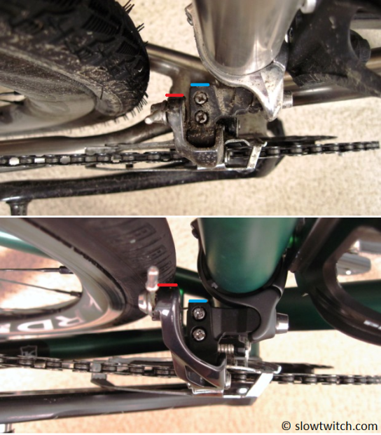 The photo below illustrates my problem. The top photo shows the old 6700 derailleur, and the bottom photo shows the new 6800 derailleur. My fancy blue and red lines are reference points – the blue is the back of the derailleur body, while the red is the position of the ‘arm’ while in the large chainring. Do not pay attention to the location of the tire on each bike; they are different sizes, and the chainstay length is not consistent between the two.