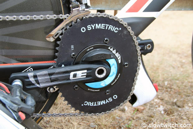Raelert rides 172.5 Rotor cranks with a Power2Max power meter and Osymetric rings.