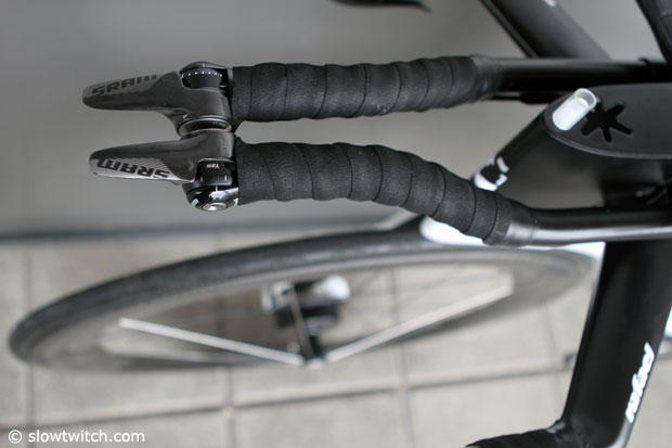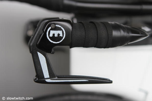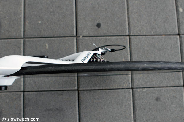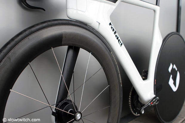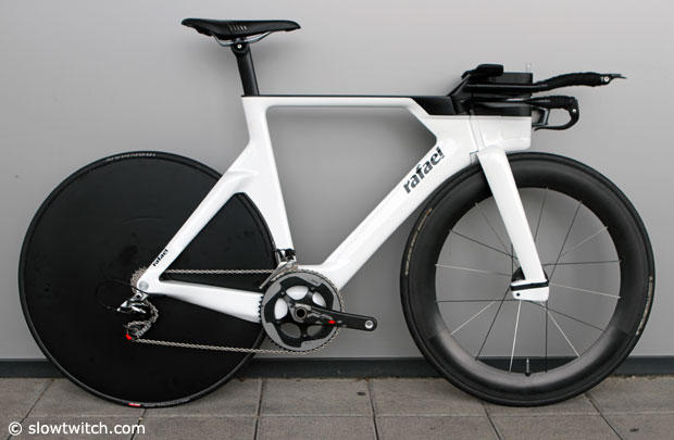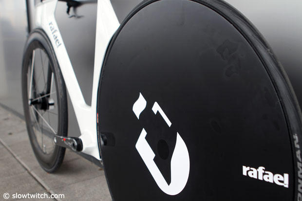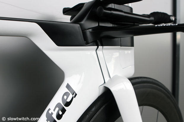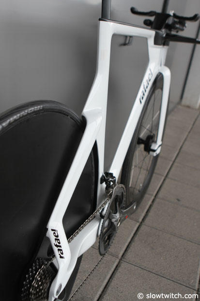 We uploaded initial pictures of the new Rafael Ueberbike last week, and today I had a chance to look closer and fondle this very attractive new TT machine. Rafael Hoffleit came up with the idea for this bike a few years ago, and mostly thought about the aerodynamic advantages of this concept, but soon realized that repairs and traveling with this bike would be very simple too. Hoffleit has not yet arrived at the Eurobike show, but he allowed me to get my hands on it. Sadly it was an overcast and rainy day in Friedrichshafen, and thus the slightly more dreary images, but you will still see all the details.