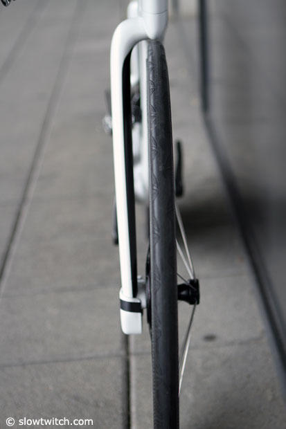 Up close with the brake setup of this Rafael Ueberbike. The front brake felt solid and the wheel spun without resistance. But I did not ride the bike.