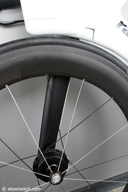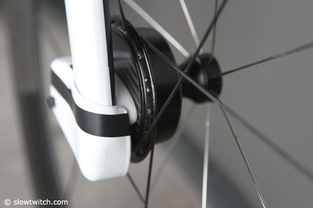 Without a drive side fork leg in the way, it is easy to see the hub that houses the internal hydraulic brake.