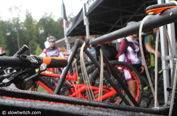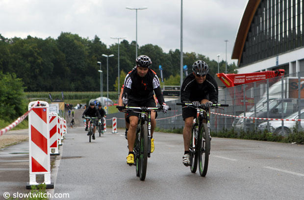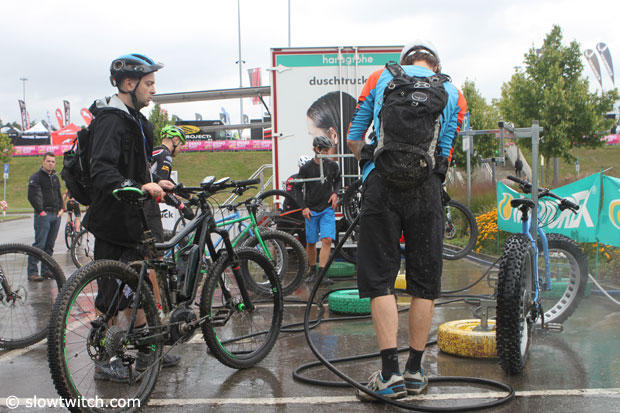 The 2014 Eurobike show opened today with a demo day, but it for the first time was right next to the exhibit halls. Until recently it was held some 50km away in Argenbühl in the Allgäu, and while stunningly beautiful, to some it was just too much of a hike to get there. Judging from today it appears that both the exhibitors and trade visitors embraced the new more convenient location, but the weather was not paying along nicely.