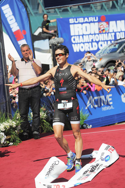 Jan Frodeno did arrive at T2 ahead of Gomez, but the 4-time ITU World Champion outran the 2008 Olympic gold medalist for the title.