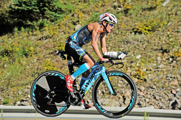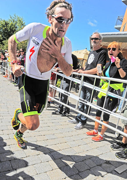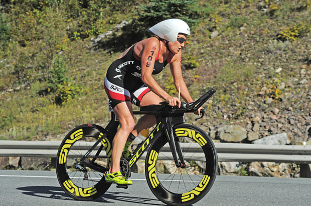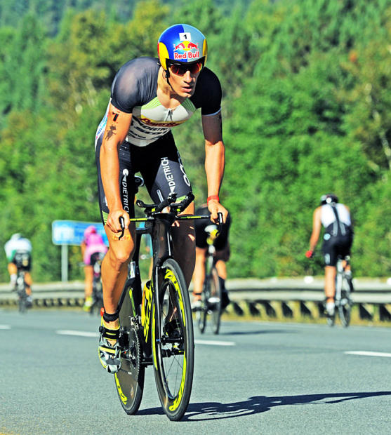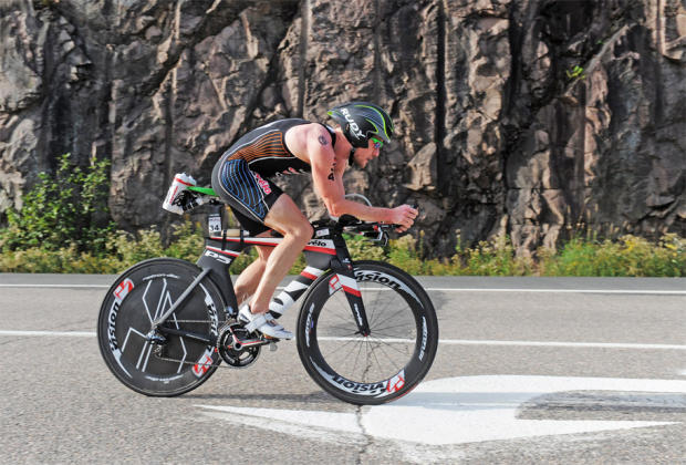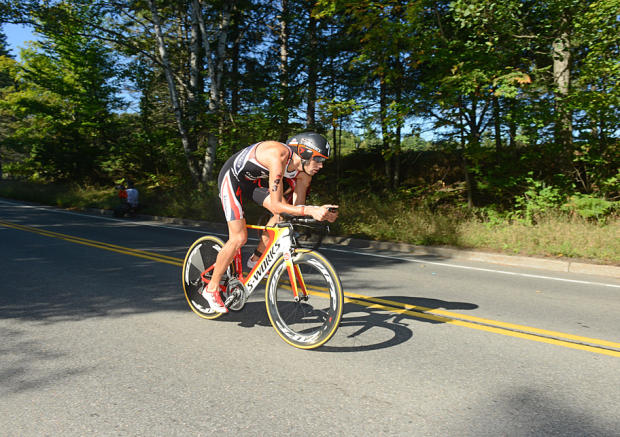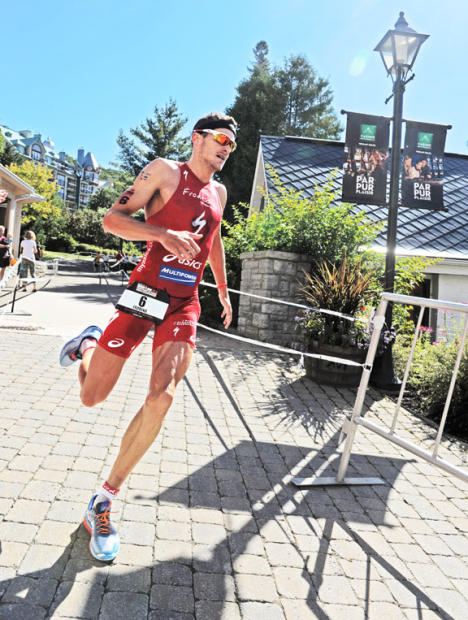 Jan Frodeno's long legs fly on the downhill in Mt. Tremblant Village.