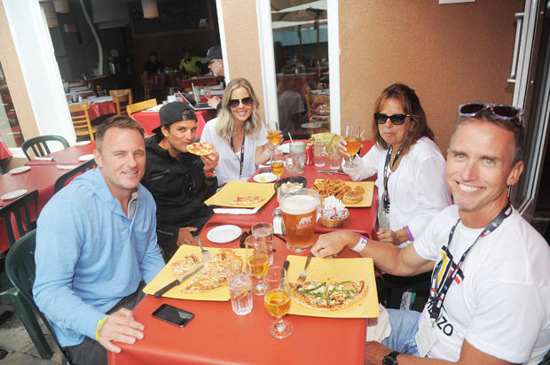 Terenzo Bozzone, his wife and relatives celebrate a top 10 finish with a café pizza.