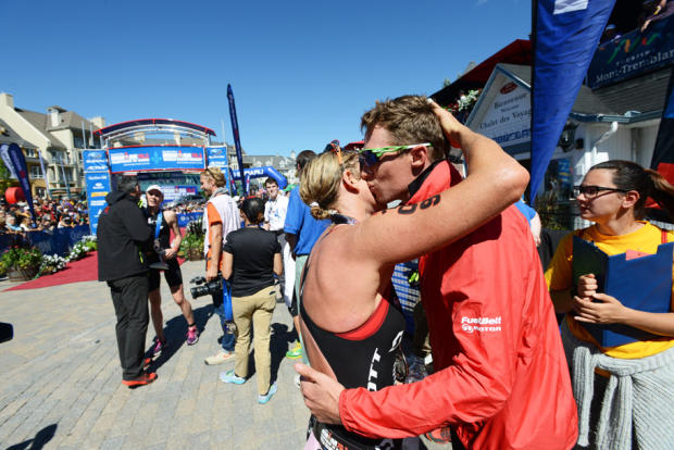 James Cunnama congratulates Jodie Swallow with a kiss at the finish.