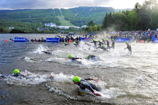 And they're off with the Mt. Tremblant Village and gondola in the background.