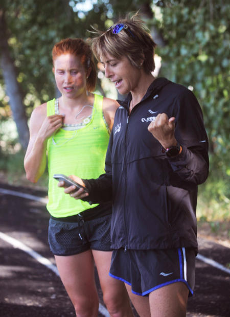 Siri Lindley gives Jodie Swallow a double high five before a track workout in Niwot.