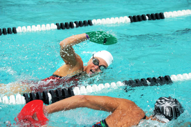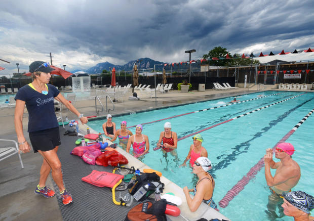 Dede Griesbauer, wearing a swim training snorkel, jumps in the pool with Valentina Carvallo and Ellie Salthouse in background.