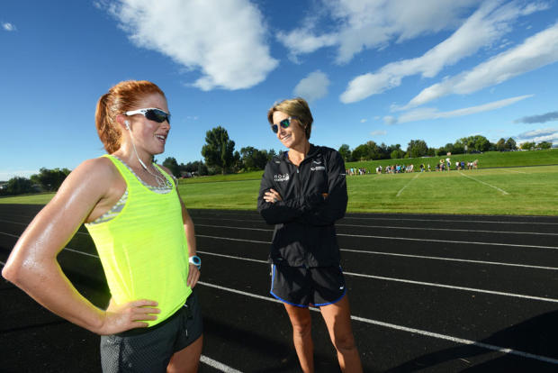 Lindley with Paula Findlay before the track workout in Niwot.