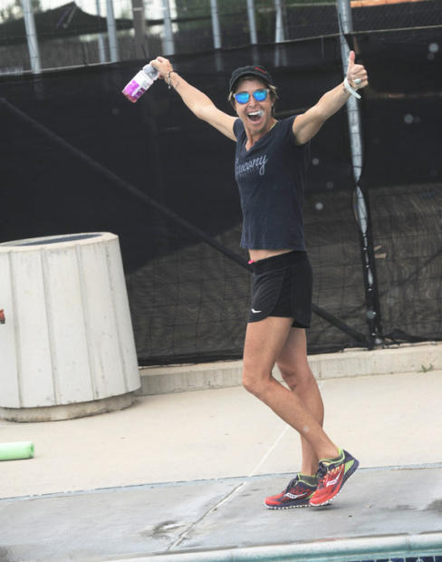 Siri Lindley gives Jodie Swallow a double high five before a track workout in Niwot.