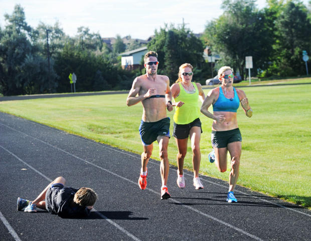 Lindley lays on the track to get a better smartphone shot of James Cunnama, Paula Findlay and Jodie Swallow running together during a track set at Niwot.