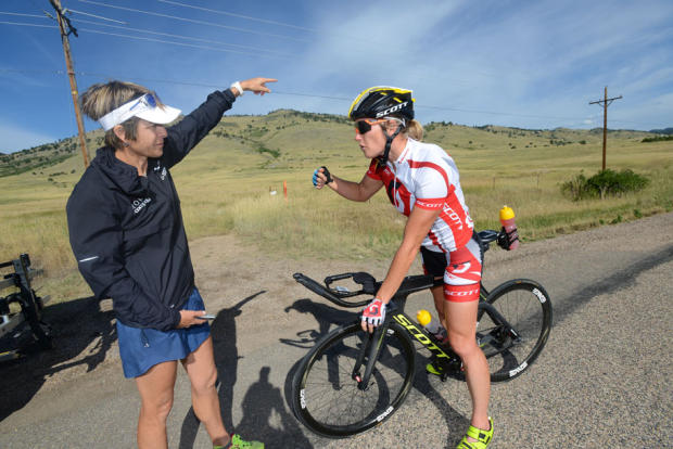 Lindley offers precise guidance to Jodie Swallow during the bike workout.