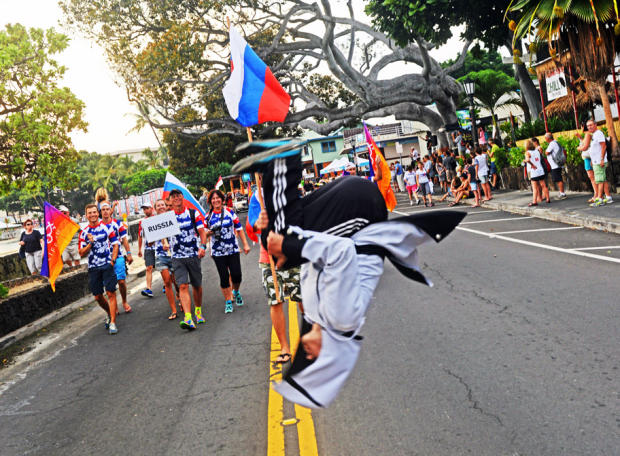 Formal activities at Kona kick off with the kids duathlon and the Parade of Nations.