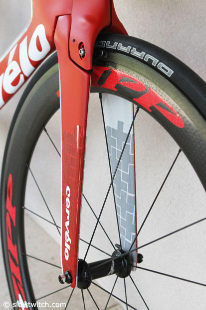 In order to get the right fit Steffen and the Cervelo team opted for a 3T 100mm Arxa stem that is adjustable, but is set up here at – 45. The beard was custom modified to accept the stem.