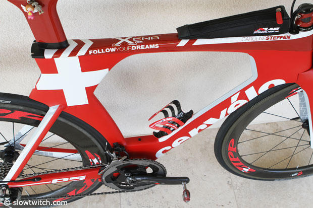 Caroline Steffen rides a 56cm Cervelo P5 and the paint scheme came from Cervelo graphic designer Tom Briggs.