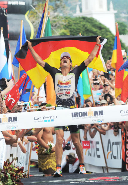 Framed by the German flag, Sebastian Kienle looks to the skies, grateful for his Kona victory.
