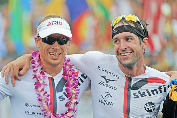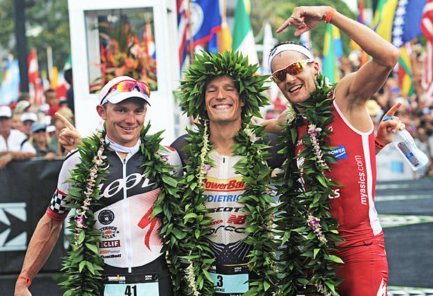 Flanked by podium finishers Ben Hoffman and Jan Frodeno, winner Sebastian Kienle wears his victory lei looking like a happy, mischievous Puck in Shakespeare's A Midsummer Night’s Dream.