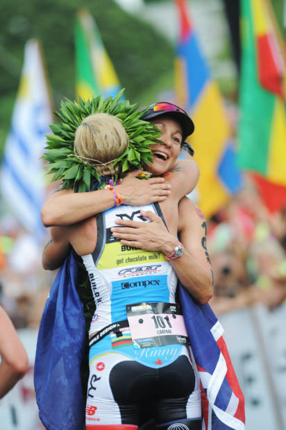 Winner Rinny Carfrae hugs good friend Rachel Joyce after her 3rd place finish.