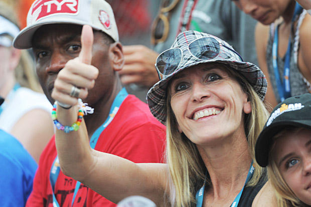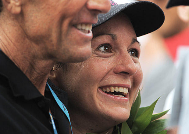 Flanked by her coach, 6-time Ironman World Champion Dave Scott, Rachel Joyce flashes a transcendent smile.