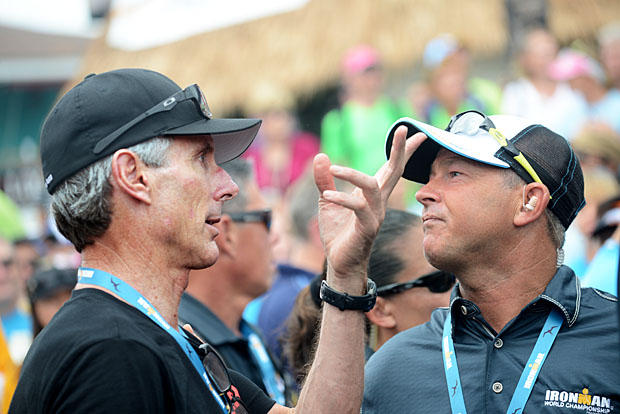 Six-time Kona champion Mark Allen makes a point with 1994 Ironman World Champion and current announcer Greg Welch.