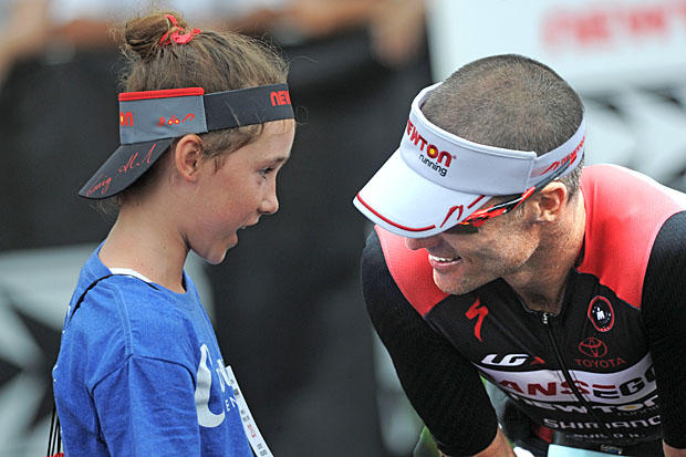 After his 13th place finish, three-time Ironman World Champion Craig Alexander shares a moment with his daughter Lucy.