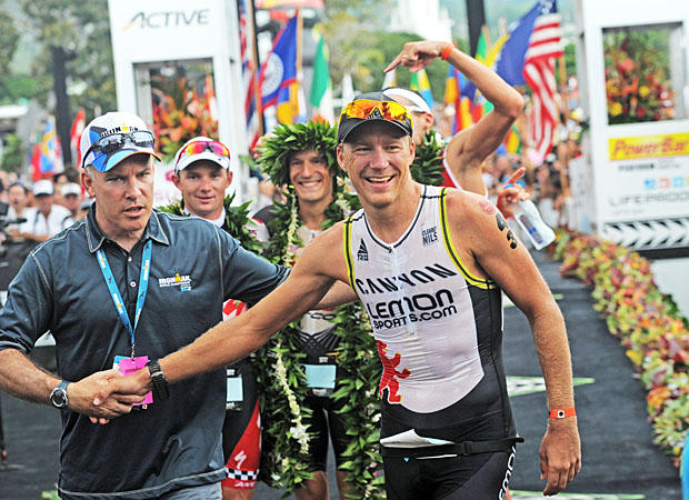 Ironman CEO Andrew Messick congratulates Frommhold.