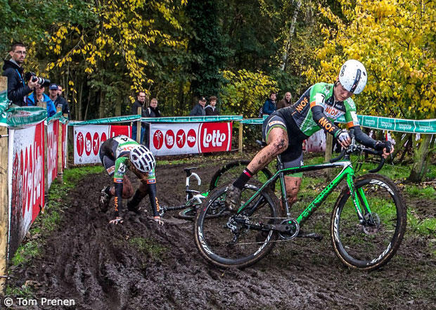 Mud, mud and more mud dominated the 2014 Superprestige Gavere race, but that is what makes cyclocross so popular in Europe. The nastier the conditions the better for the fans. This weekend Sanne Cant and Nikki Harris dominated the women's race and Klaas Vantornaut ran away with the men's title. In the pic below, eventual 5th place getter Sophie De Boer ate some mud when she collided with American Elle Anderson who finished 8th.
