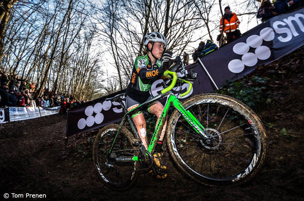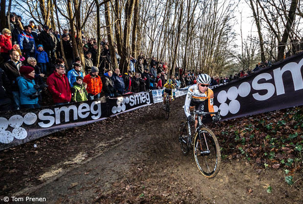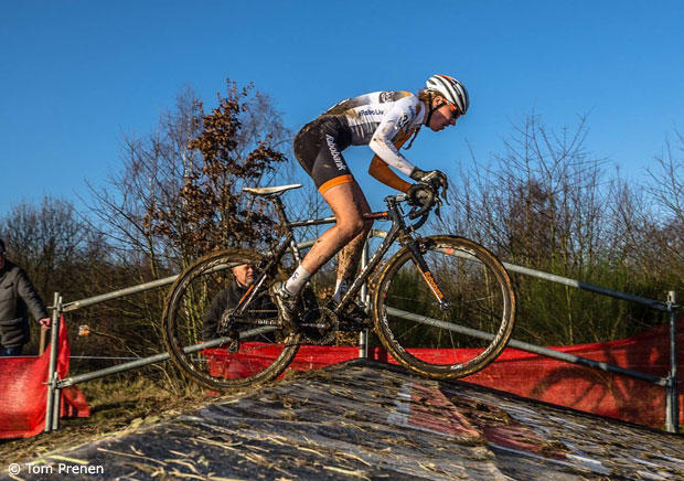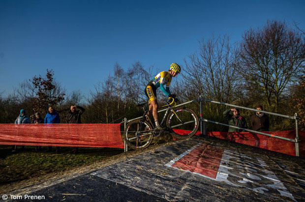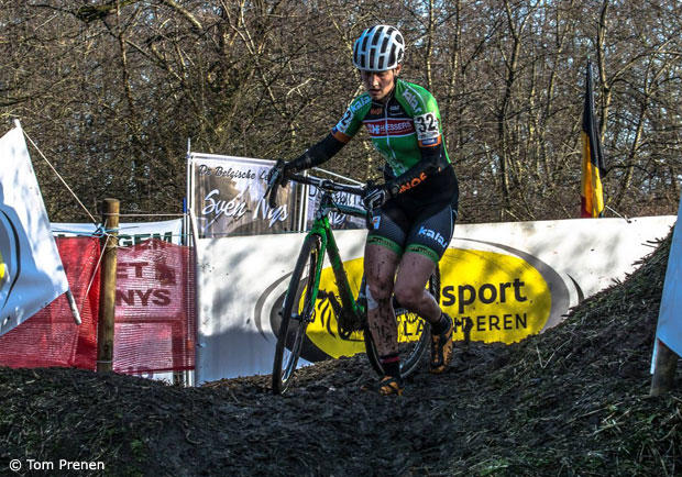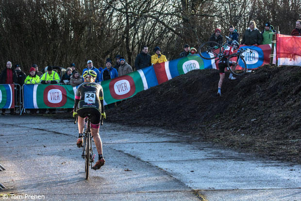 The course in Leuven has many tricky sections and Gertie gets ready for a quick run-up to chase Meg De Bruyne.