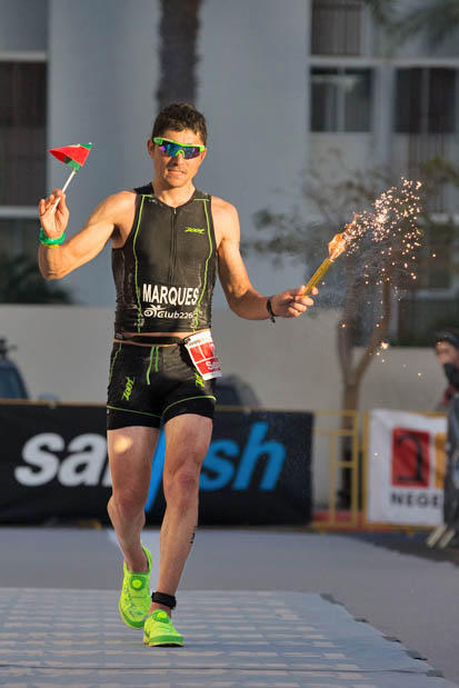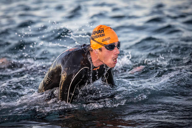 Race favorite Sergio Marques finishes the first of two laps of the swim.