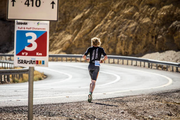 Diederik Scheltinga (NED) starts the run and passes the 3k sign at the 2015 Israman Triathlon
