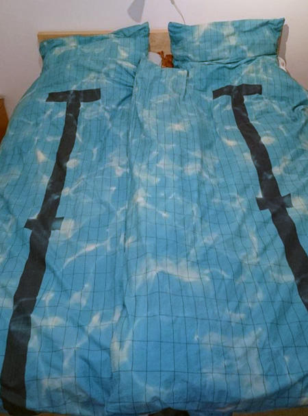 We all have an image in mind when we hear the word pool set, but it likely is not the one Sebastian Kienle recently tweeted about. When you go to bed with these sheets you will likely dream about the  black lines too, and possible do a few backstrokes while you are sleeping. We are not sure who makes those sheets, but it is clearly a Euro thing. Otherwise there would not be two covers on such a tiny bed.