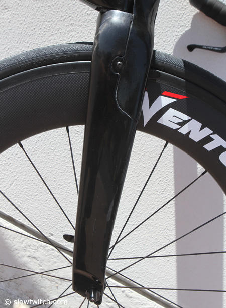 The same is true for the fork. It is a place holder or test fork that allows Leanda Cave to ride the Ventum and give feedback. This one houses an integrated TRP brake.