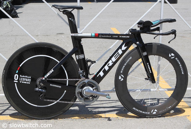 Dirk Bockel's Speed Concept (below) probably could have been a size smaller than it is, most likely. If so, it would have had a front end that looks more like the one on Chris Legh's bike. Dirk's bike has the lowest of the 3 stem heights that Trek offers for its Speed Concept.