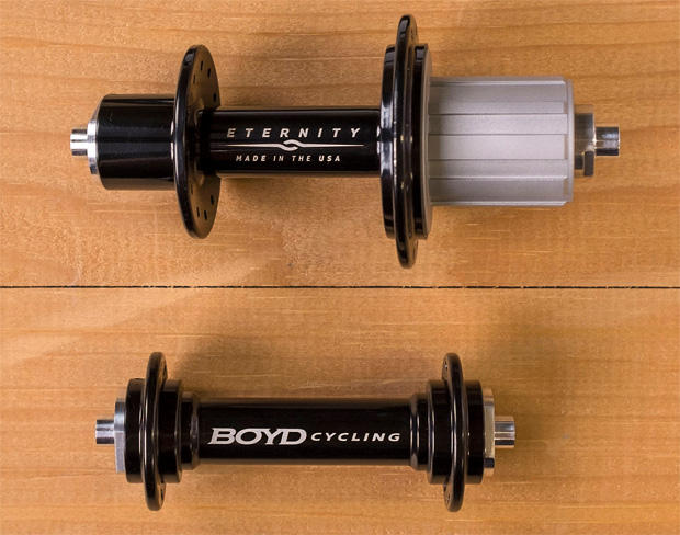 Boyd Johnson of Boyd Cycling showed a new Eternity hub system at the North American Handmade Bike Show and he has put a lot of thought and many hours of sweat equity into this project, and the man is now beaming with pride. The Eternity hubs offer very wide flange spacing and bearing stance and 5.6 degree of pawl engagement. Johnson also thought about drag resistance and keeping grit and grime out.
