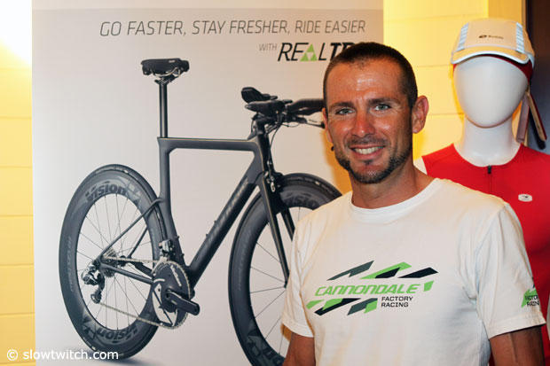 Already noted is the 105 build on the Slice. The highest-end bike, the Slice Black Inc, nice bike, but at $10,000 complete I think most Slowtwitchers will want a bike more conceptually aero-driven. If a bike is built for a newb, you have to be a very well-heeled newb to want to spend $10,000 for a bike designed to specifically work for the beginner, the MOPer, and the person who is willing to give up a few seconds over an Ironman in order to have a bike that is trouble-free. (Obviously pros ride this bike successfully, such as Michelle Vesterby, her Slice pictured below, and who just won Challenge Denmark yesterday over a very good field; and Ironman champion Victor Del Corral is in front of a Slice image just above.)