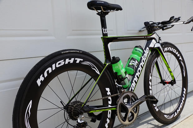 Here is look at the Shimano and Knight Composites equipped Cannondale Slice of 2015 Ironman Coeur D'Alene Champion Heather Jackson of Team Wattie Ink. Sean Wakins had just washed the bike and removed both the custom altered XLAb bento box (featuring zip ties instead of Velcro tabs) and the Speedfil BTA system that was also attached with zip ties. Heather Jackson wanted to have enough liquid nutrition on board especially in such hot conditions, thus the 3 bottle setup. The pictures (except for the final one) were taken by Sue Hutter who had given Heather Jackson and Sean Watkins a home stay in Idaho.