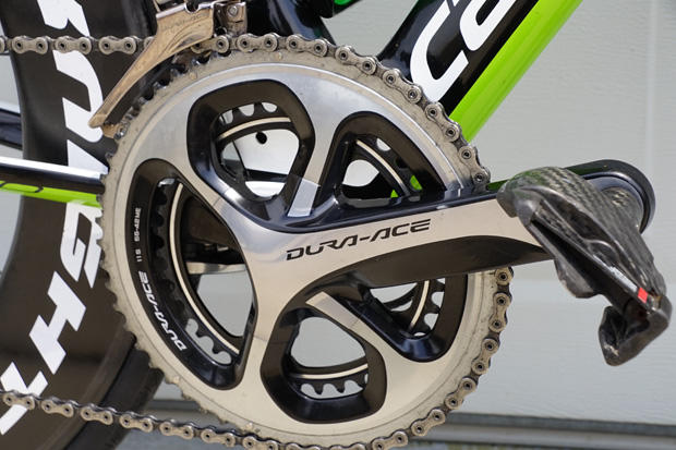 170mm Shimano Dura-Ace cranks with 55-39 rings and older Look Keo Aero pedals.