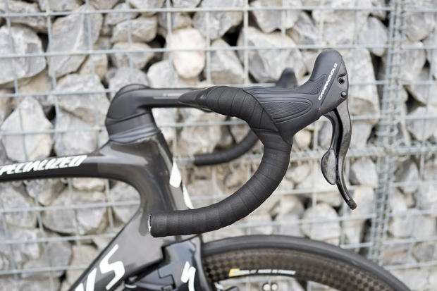 Fuglsang rides S-Works Turbo Allround 2 24mm tubular tires on Corima carbon wheels.